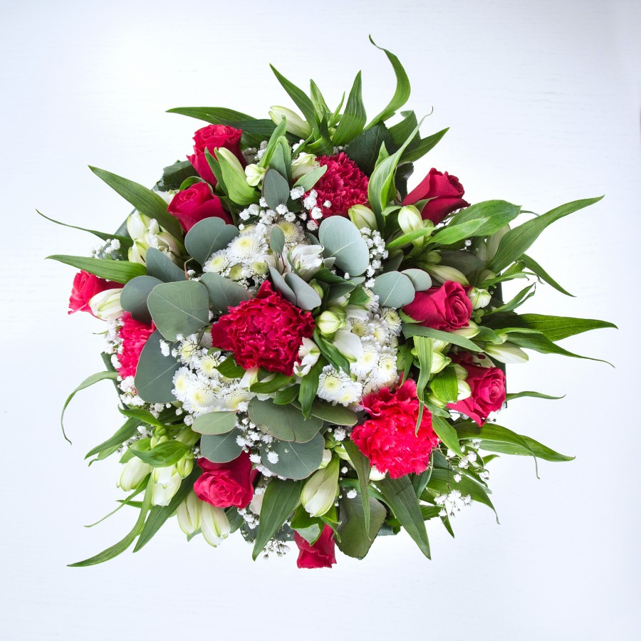 Our Blossoming Beauty Bouquet is a symphony of white chrysanthemums, gypsophila, and red roses, harmoniously blended with carnations, white alstroemeria, and aspidistra leaves. This elegant arrangement highlights the freshness and quality of each hand-selected flower, creating a stunning visual masterpiece.